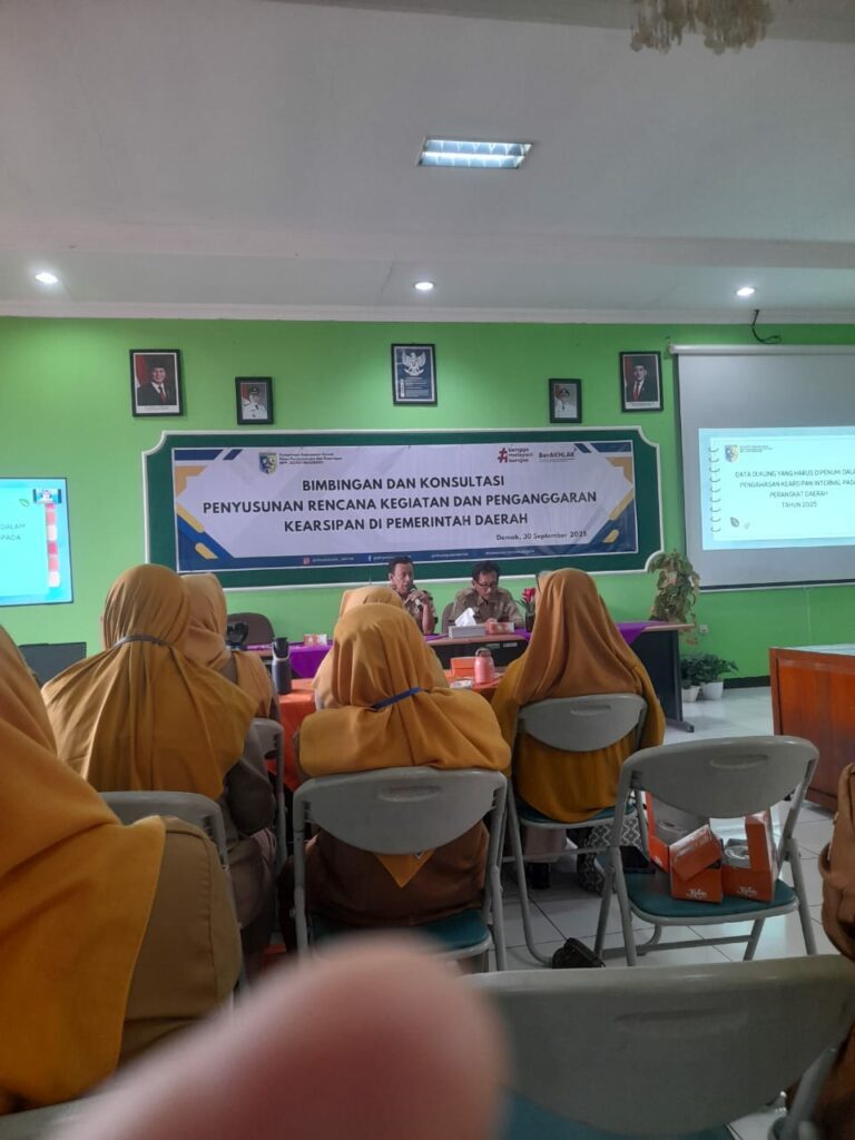 Kegiatan Bimbingan dan Konsultasi Penyusunan Rencana Kegiatan dan Penganggaran Kearsipan di Pemerintah Daerah tanggal 30 September 2025 bertempat di Ruang Aula Dinas Perpustakaan dan Kearsipan Kabupaten Demak. Dihadiri oleh Sekretaris OPD atau yang mewakili. Rapat dipimpin oleh Kepala Dinperpusar Kabupaten Demak. Melalui zoom meeting, materi penganggaran kearsipan disampaikan oleh Jawa Barat dan Yogyakarta sebagai sampel karena dinilai oleh ANRI mempunyai sistem penganggaran yang sudah baik. Untuk Kabupaten Demak dalam penilaian arsip tingkat provinsi, meraih peringkat 10 besar dengan nilai 88,8. Untuk OPD di bawah nilai tersebut, agar dapat meningkatkan pengelolaan arsipnya. Rencana gelar pengawasan kearsipan sekitar bulan Oktober 2025.