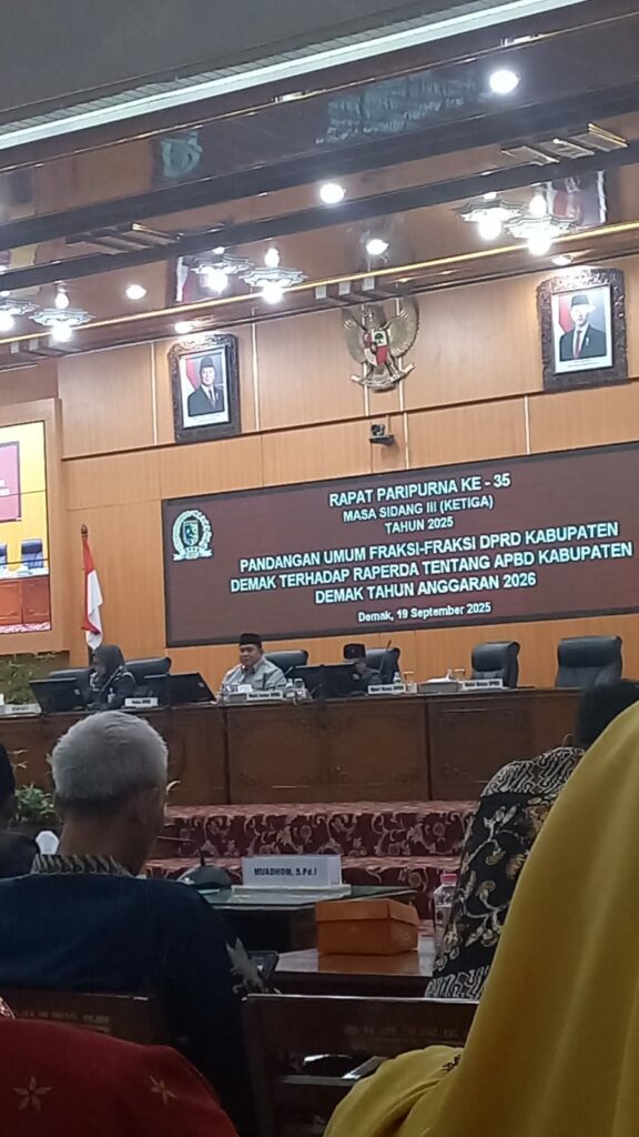 Rapat paripurna ke 35 masa sidang III tahun 2025 ttg pandangan umum fraksi² DPRD kab. demak terhadap Raperda APBD 2026, jumat 19 september 2025. hadir Bupati, Ketua dan wakil Ketua DPRD, anggota DPRD, Unsur Forkopimda, Sekda dan asisten sekda, Plt Setwan, PD, Kec dan undangan lain.