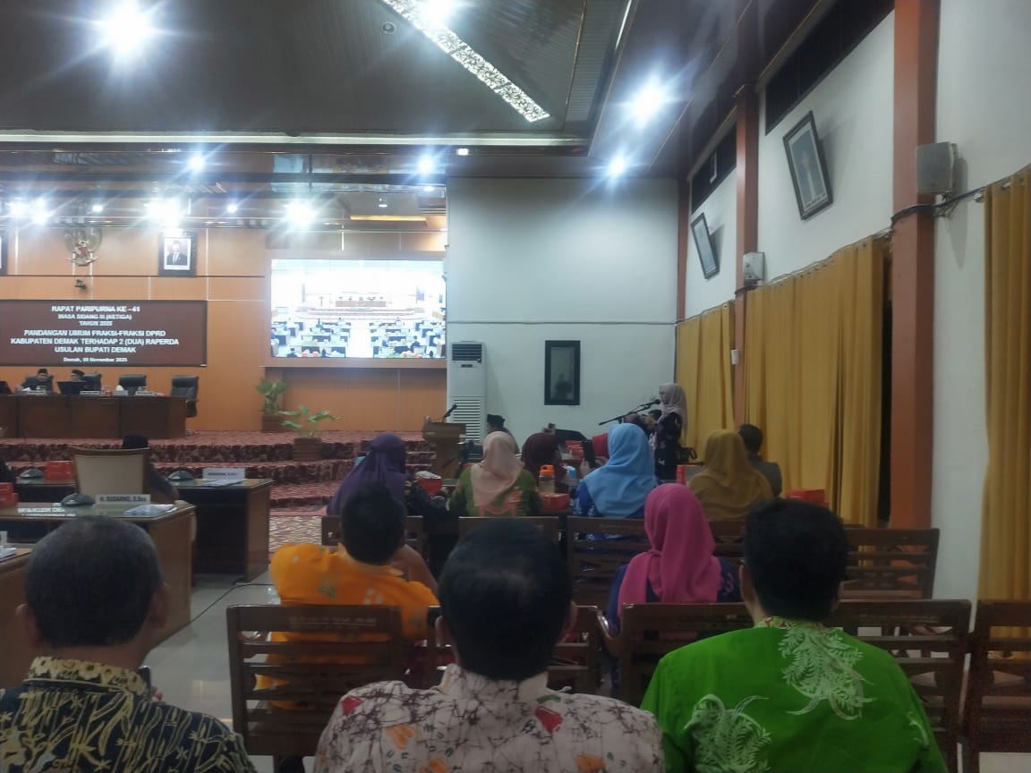Rapat paripurna ke 41 masa sidang III (ketiga) tahun 2025 Pandangan umum fraksi fraksi DPRD Kab Demak terhadap 2 Raperda usulan Bupati Demak, Kamis, 06 November 2025 dengan dihadiri Wabup, dipimpin oleh Ketua DPRD, dengan 50%+1 anggota DPRD, perwakilan OPD selaku tamu undangan