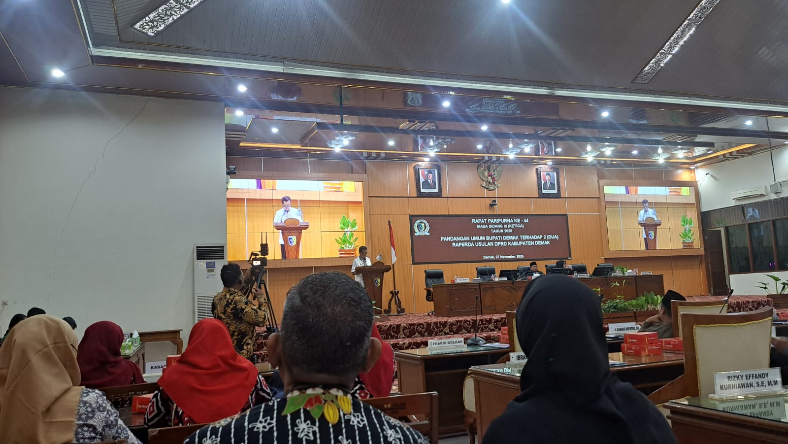 Rapat Paripurna ke 44 Masa sidang ke 3 tahun 2025 dgn acara pandangan umum Bupati Demak terhadap 2 Raperda Usulan DPRD Kabupaten Demak tentang Pengelolaan Sumber Daya Air dan Raperda tentang Keterbukaan Informasi Publik yg disampaikan oleh Sekda Kabupaten Demak